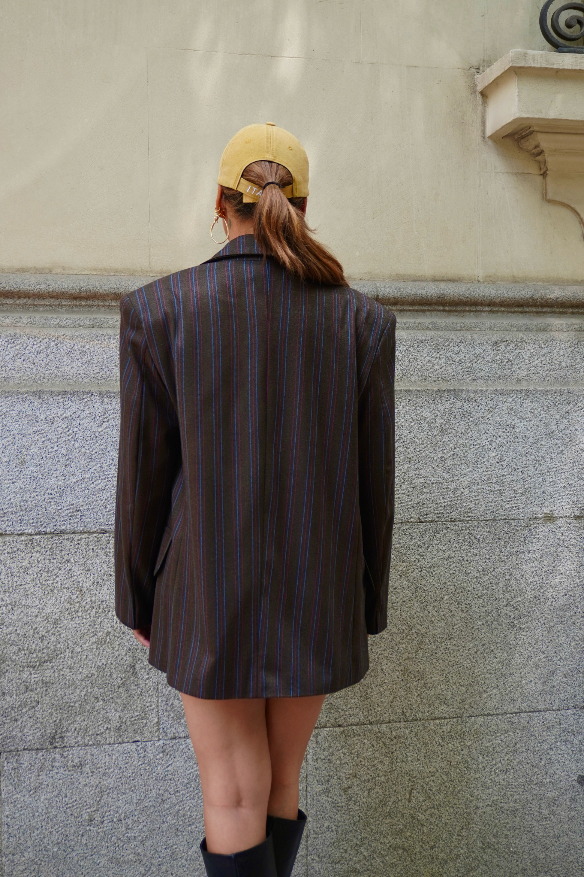 Blazer con diseño de rayas multicolor sobre fondo marrón chocolate. Modelo oversized con solapas clásicas, hombreras internas y cierre frontal con botones. Incluye bolsillos delanteros de solapa y estructura recta que aporta un estilo urbano y relajado. Ideal para combinar con vestidos ajustados o prendas básicas.