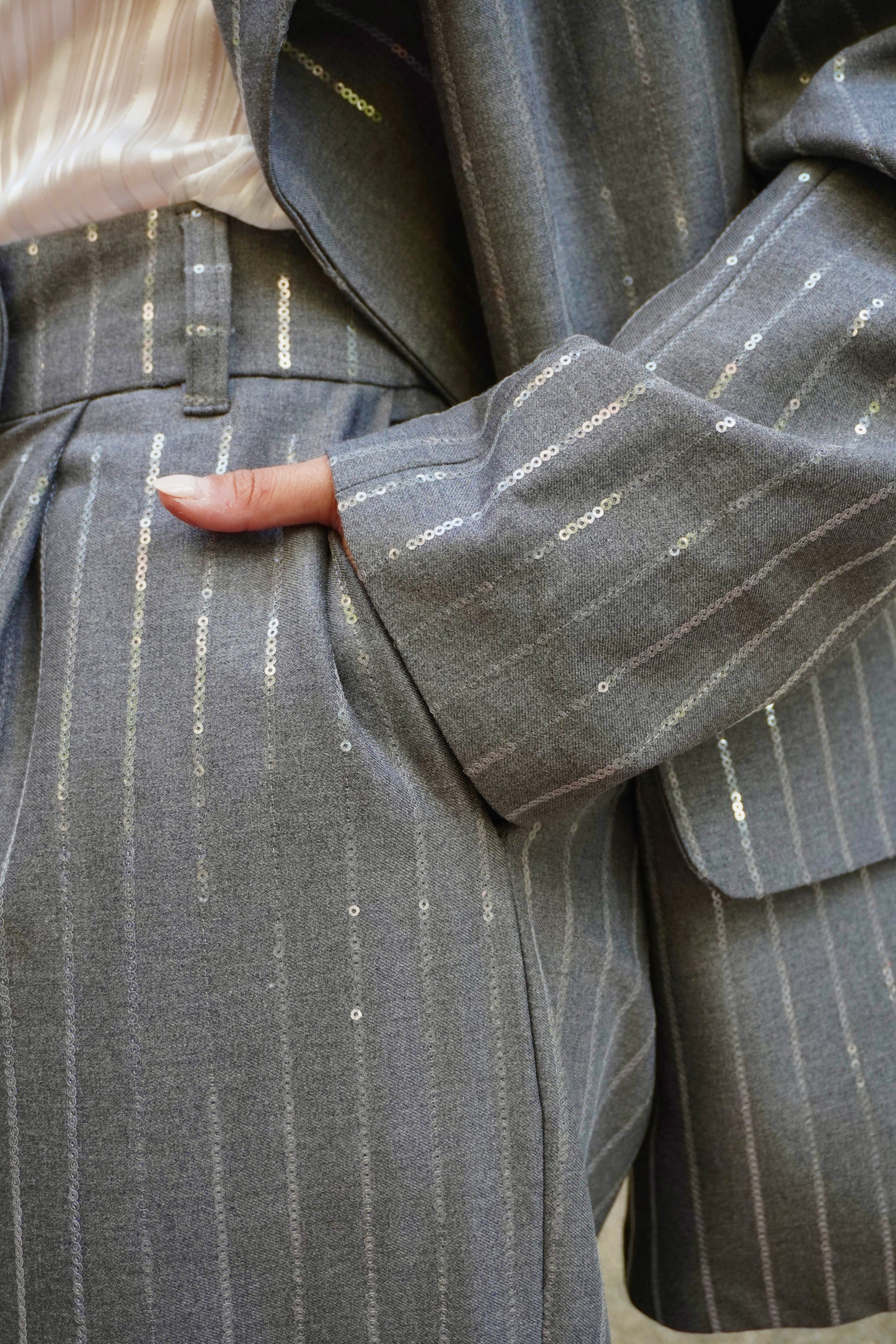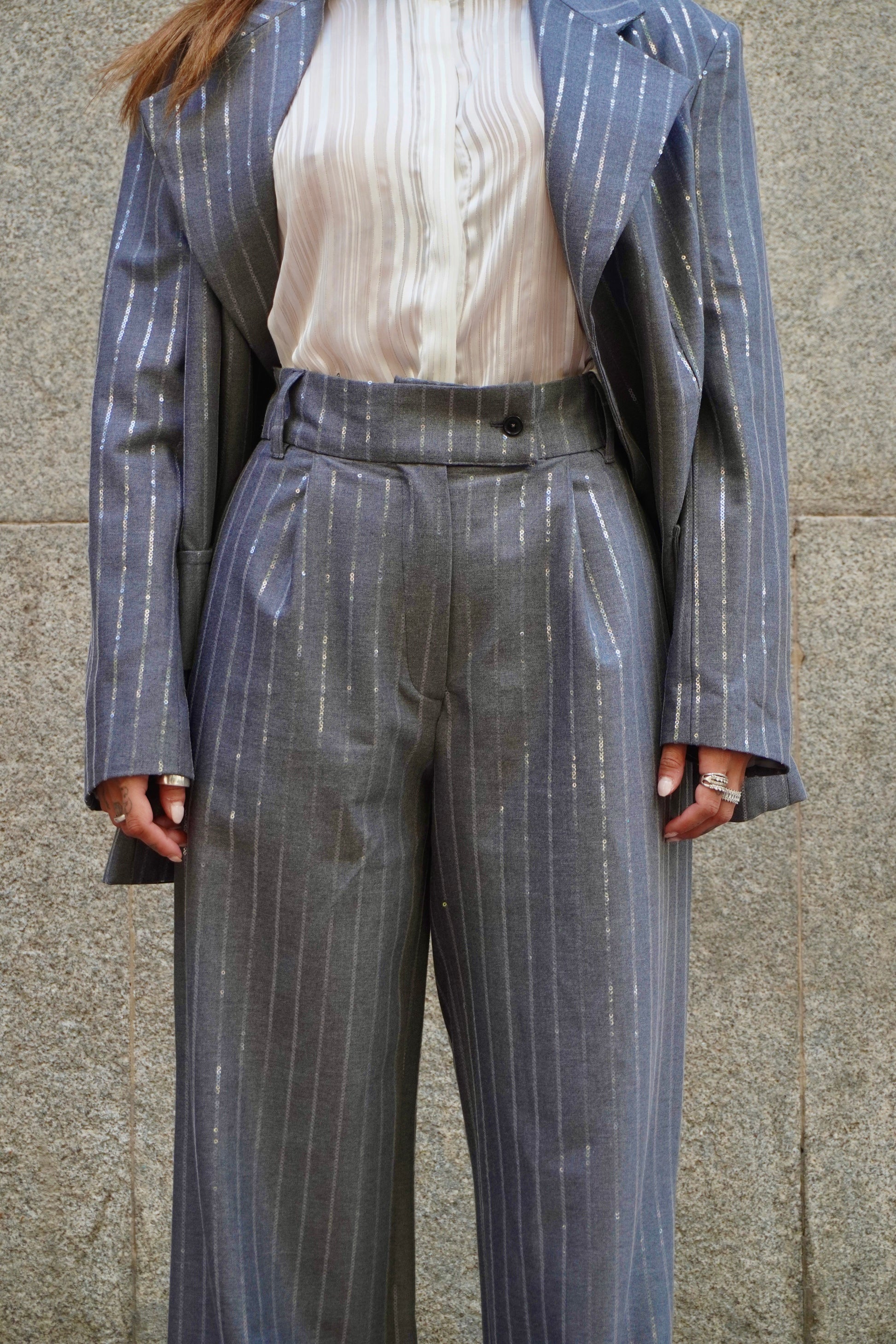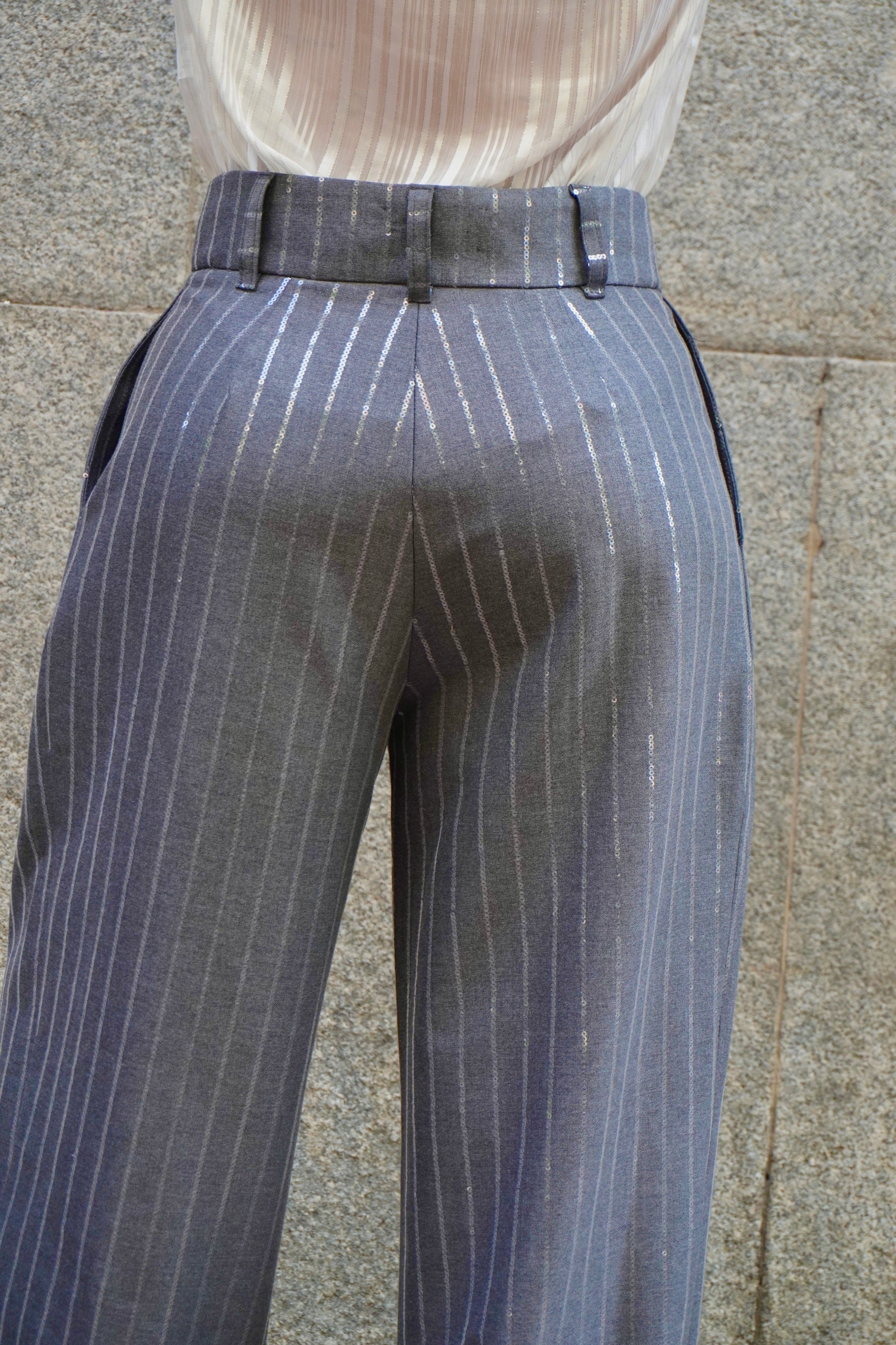 tejido con raya diplomática. Pantalón de tiro medio-alto, recto, con pinzas delanteras y raya marcada. Cintura con cierre de botón interior, gancho y cremallera.